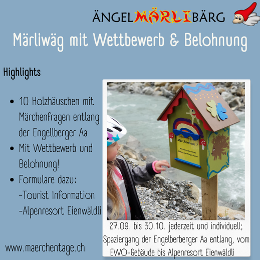 Bevor du dich auf den Weg machst, kannst du an folgenden Orten das Wettbewerbsformular mit den Märchenfragen abholen: in der Tourist Information in der Dorfstrasse, oder im Alpenresort/Camping Eienwäldli.